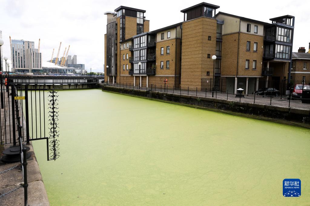由于當地氣溫升高等原因,英國倫敦泰晤士河畔碼頭的一處水域被浮萍覆蓋。