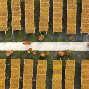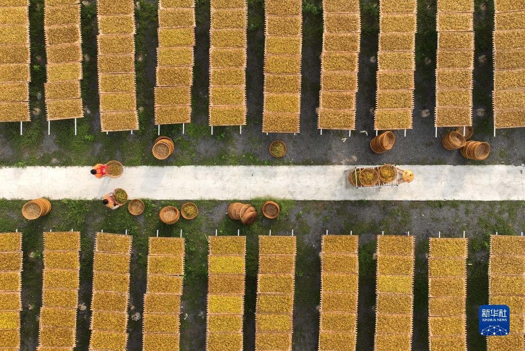 6月30日,在衡陽(yáng)市祁東縣黃土鋪鎮,村民在晾曬黃花菜(無(wú)人機照片)。
