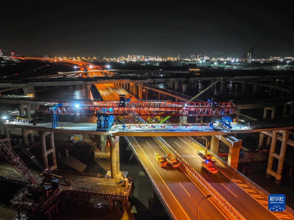 當日,在杭甬復線(xiàn)寧波一期濱?;ネㄊ┕がF場(chǎng),濱?;ネɡ^主線(xiàn)和F匝道兩次上跨之后,第三次成功跨越金塘大橋,為實(shí)現年底建成目標邁出重要一步。新華社發(fā)(姚峰攝)