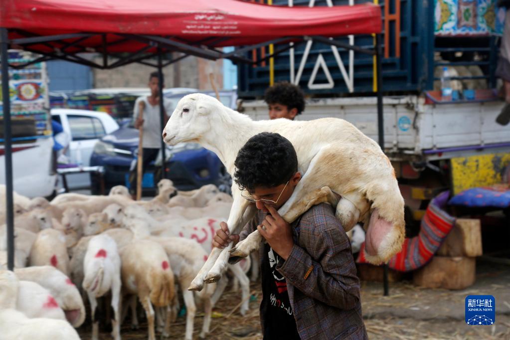 6月25日,在也門(mén)薩那一處牲畜市場(chǎng),一名少年扛著(zhù)買(mǎi)來(lái)的羊。