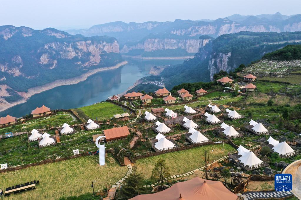 這是貴州省黔西市新仁苗族鄉化屋村沿岸的露營(yíng)基地(5月30日攝,無(wú)人機照片)。