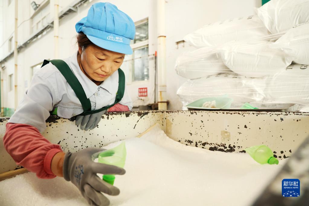 6月30日,在山東辛化硅膠有限公司,工人在挑揀硅膠顆粒中的雜質(zhì)。