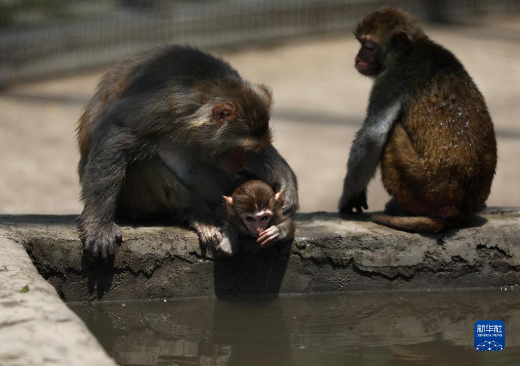7月1日,幾只小猴在鞍山市動(dòng)物園猴山里的水池旁戲水納涼。