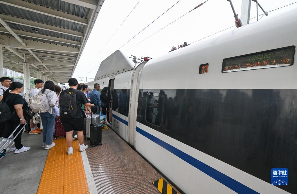 7月1日,在四川樂(lè )山站,乘客登上成都東站開(kāi)往香港西九龍站的G2963次列車(chē)。