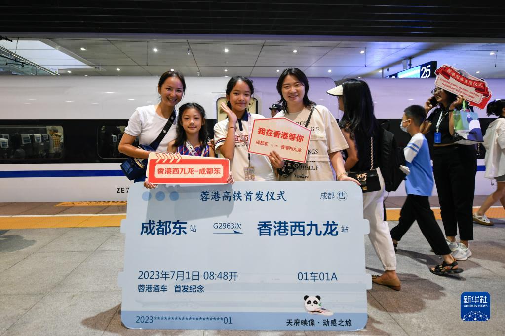 7月1日,搭乘成都東站開(kāi)往香港西九龍站G2963次列車(chē)的旅客在成都東站站臺上拍照留念。