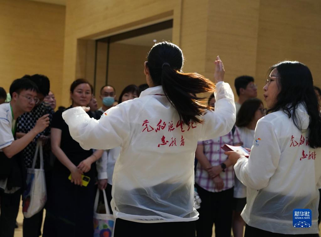 7月1日,手語(yǔ)講解志愿者、上海市第四聾校教師彭晨煒(左)為聽(tīng)障參觀(guān)者進(jìn)行手語(yǔ)講解。