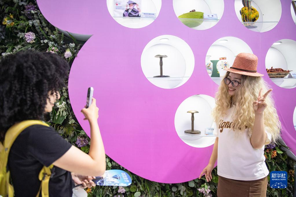 7月1日,觀(guān)眾在博覽會(huì )上佩戴著(zhù)假發(fā)產(chǎn)品拍照留念。