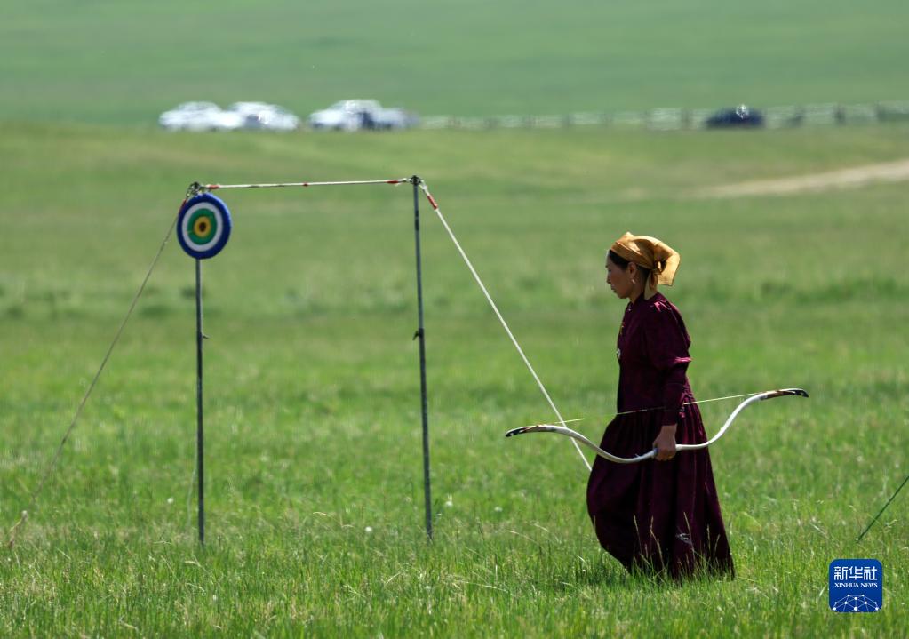 7月1日,一名參加射箭比賽的女選手去靶標后面撿拾箭支。