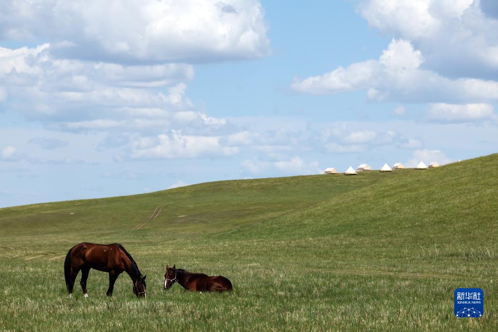7月1日,兩匹馬在開(kāi)幕式附近的草地上休息。
