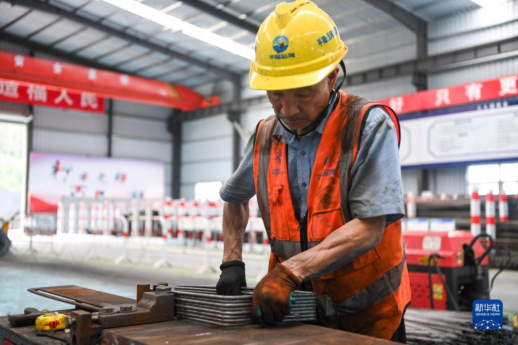 7月1日,在平陸運河馬道樞紐建設現場(chǎng),工人在加工鋼筋構件。
