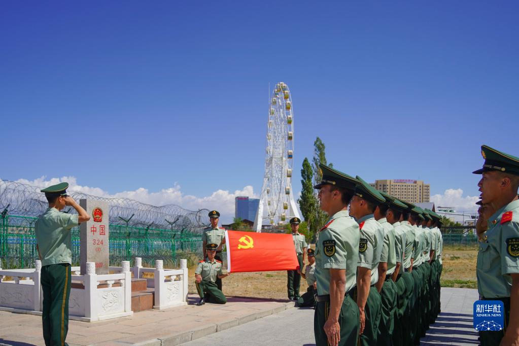 7月1日,武警兵團總隊執勤某支隊組織黨員到新疆霍爾果斯口岸,在中哈324號界碑前重溫入黨誓詞。