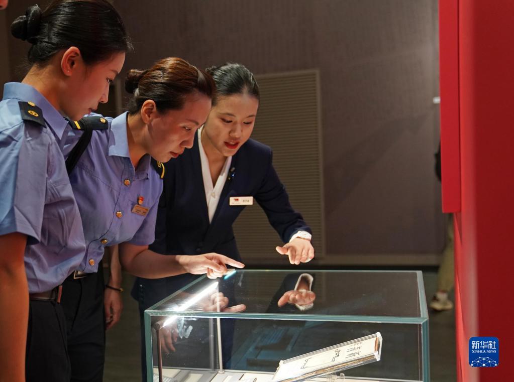 6月29日,中共一大紀念館講解員為紅色旅游列車(chē)乘務(wù)組黨員代表介紹《新青年》雜志。