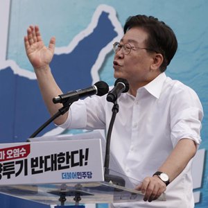 7月1日,韓國最大在野黨共同民主黨黨首李在明在首爾舉行的“譴責福島核污染水海洋排放泛國民大會(huì )”上發(fā)言。