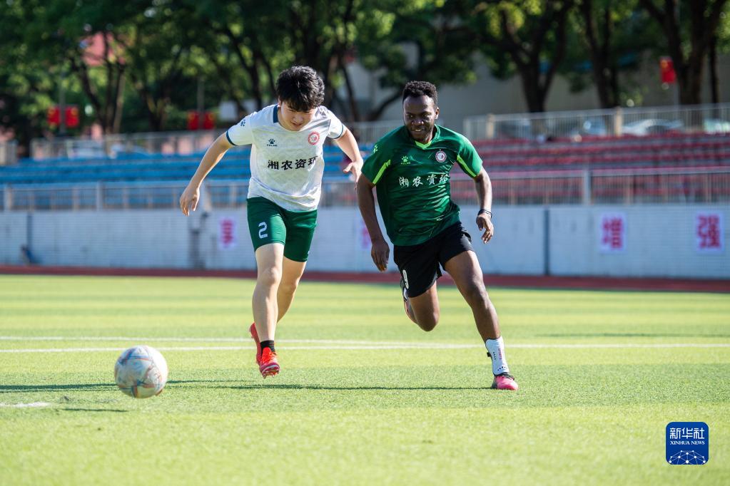 6月26日,尼克(右)和同學(xué)在湖南農業(yè)大學(xué)操場(chǎng)踢足球。