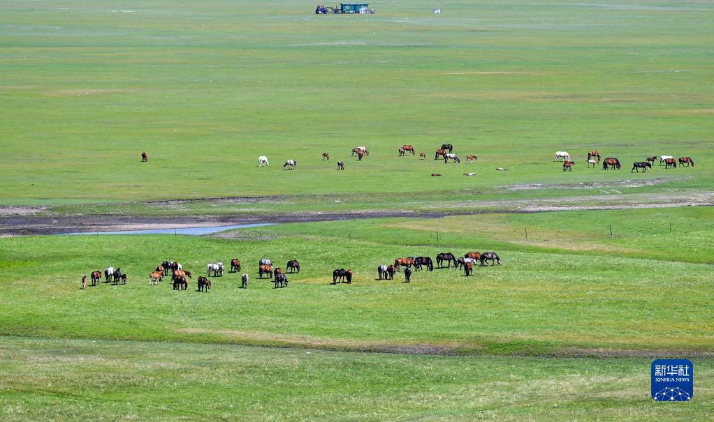 7月1日,馬群在河畔的草原上覓食。