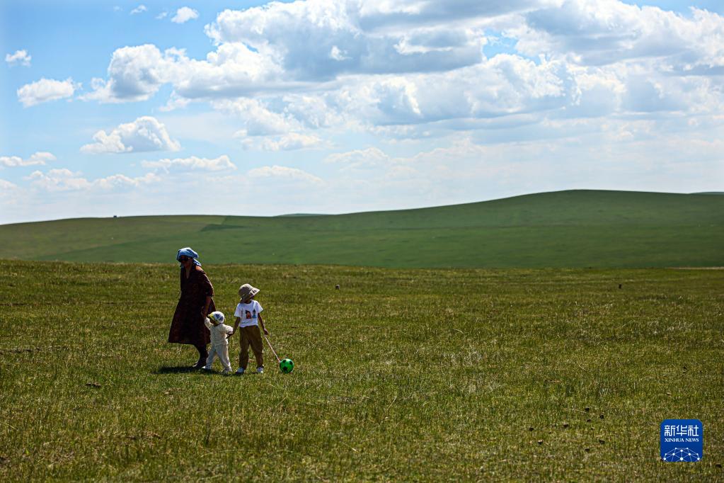7月1日,在呼倫貝爾市陳巴爾虎旗,一位牧民帶著(zhù)孩子們行走在草原上。