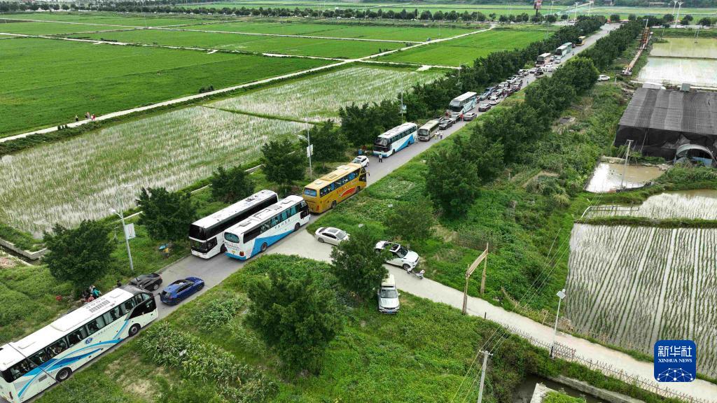 這是7月2日拍攝的在貴州省黔東南苗族侗族自治州榕江縣古州鎮三寶侗寨古榕群景區的旅游大巴(無(wú)人機照片)。