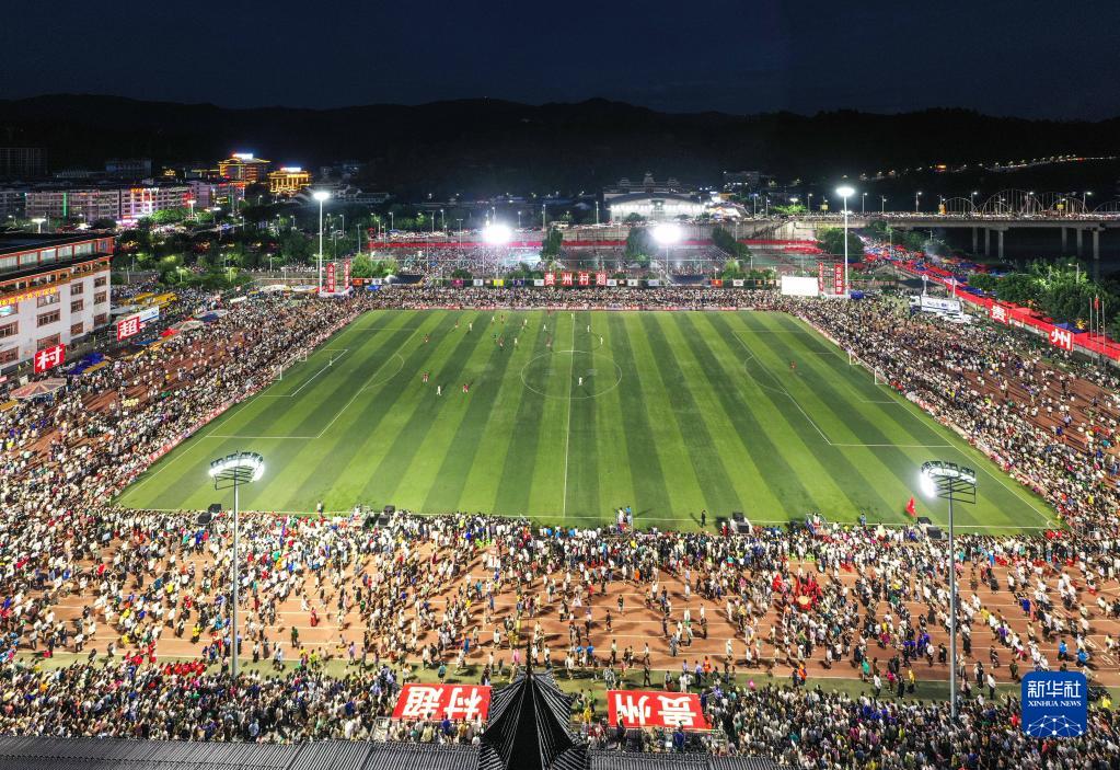 7月1日,人們在觀(guān)看貴州“村超”足球賽(無(wú)人機照片)。