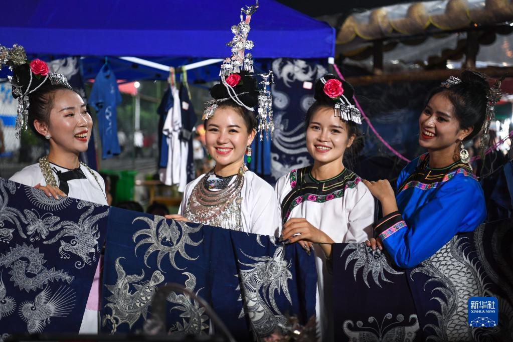 6月30日,村民在貴州“村超”足球賽場(chǎng)旁的文創(chuàng )攤位展示民族服飾。