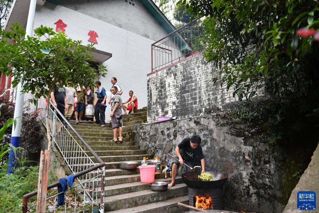 7月2日,村民在湖南省湘西土家族苗族自治州古丈縣巖頭寨鎮草潭村一學(xué)校內集中用餐。