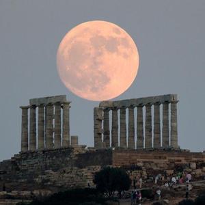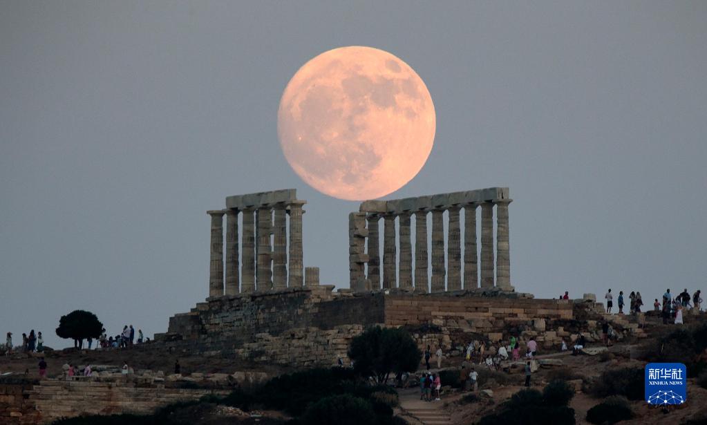 7月2日,一輪滿(mǎn)月出現在希臘蘇尼翁的海神廟遺址上空。