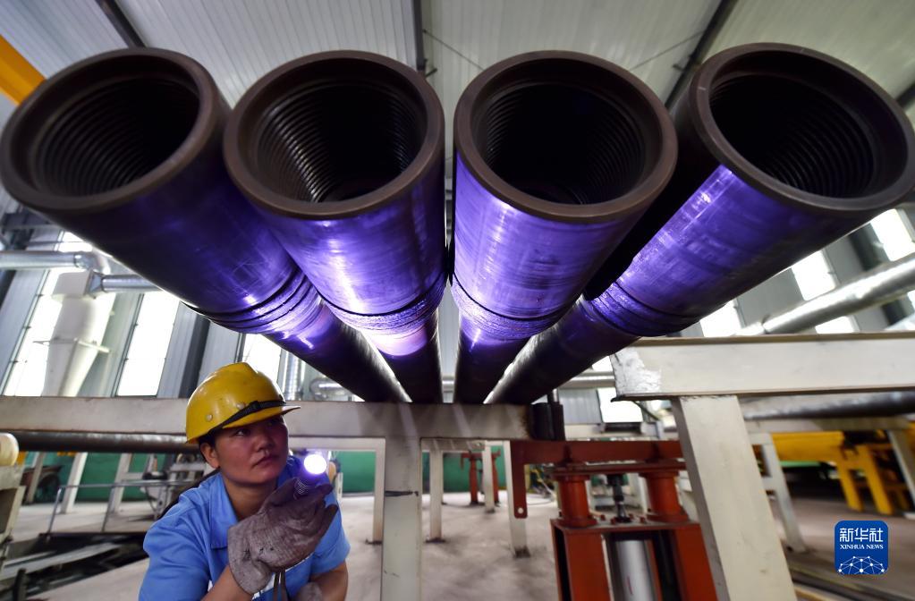 7月3日,在河北省晉州市營(yíng)里鎮一家地質(zhì)裝備生產(chǎn)企業(yè),工人進(jìn)行鉆桿焊縫檢查。