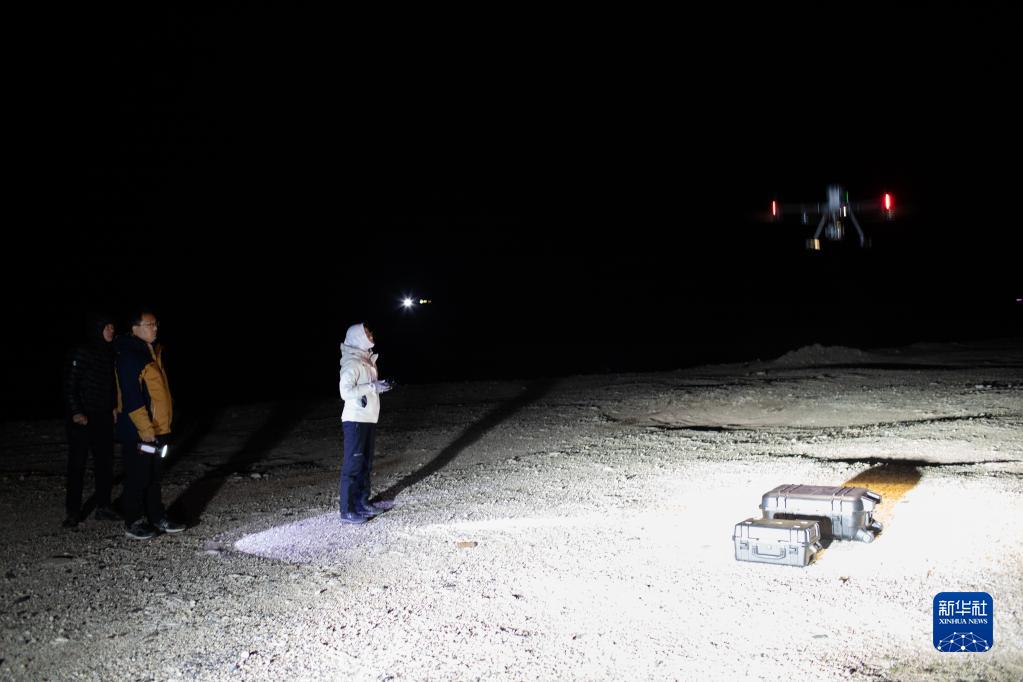 6月16日凌晨,連新明團隊在青藏公路楚瑪爾河大橋附近,使用無(wú)人機監測藏羚羊遷徙途中的夜宿地。