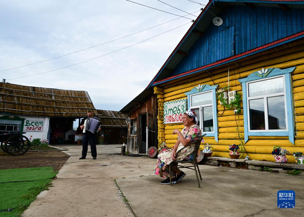 6月28日,考占花(右)坐在庭院里,薩沙在拉手風(fēng)琴??颊蓟ㄊ撬_沙的嫂子。