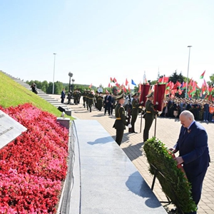 7月3日,白俄羅斯總統盧卡申科在明斯克郊外的光榮崗紀念碑前敬獻花圈。