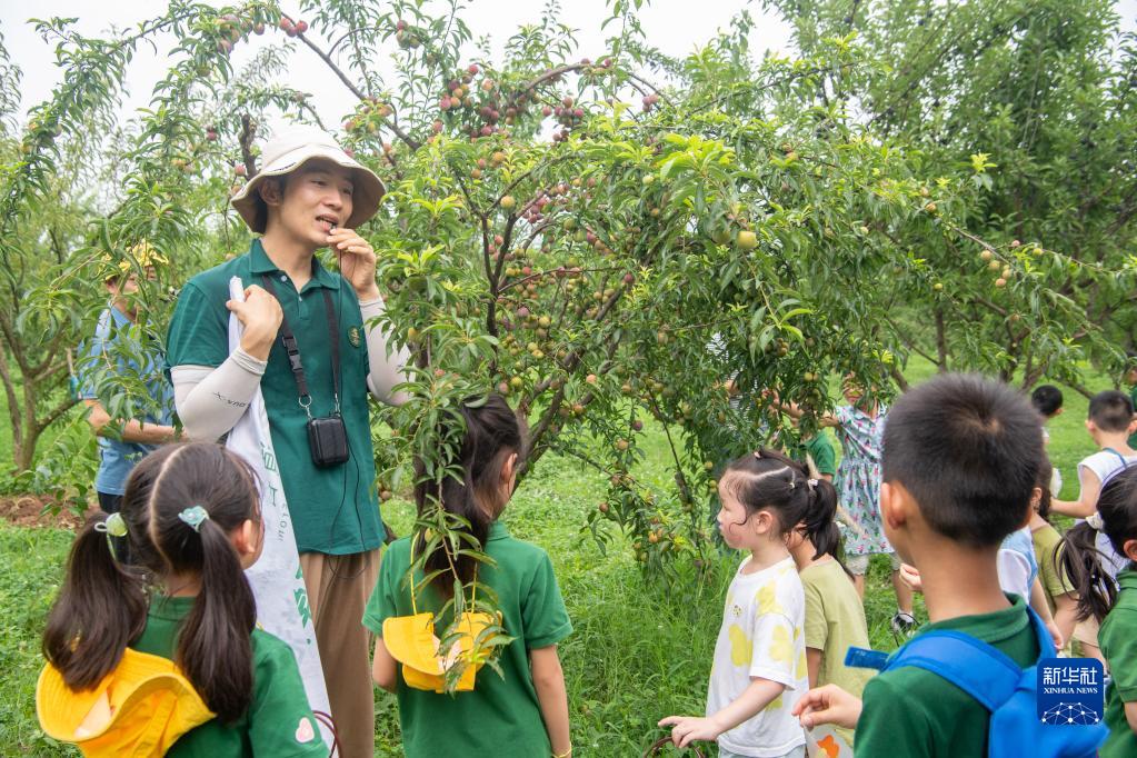 7月3日,研學(xué)課老師在廣陽(yáng)島的“生態(tài)研學(xué)課程”上向孩子們講解李子的種植知識。