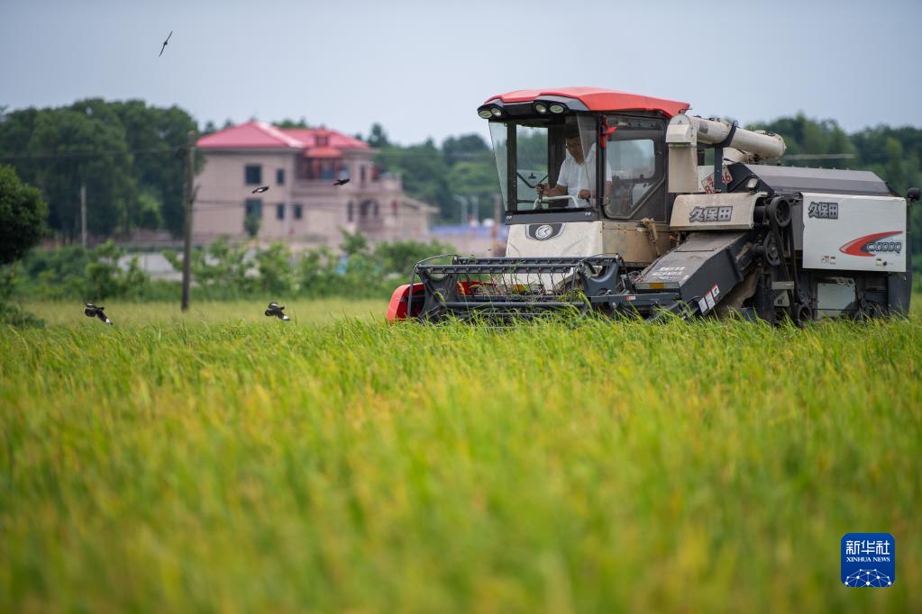 7月4日,在長(cháng)沙市望城區茶亭鎮蘇蓼村,收割機在收割早稻。
