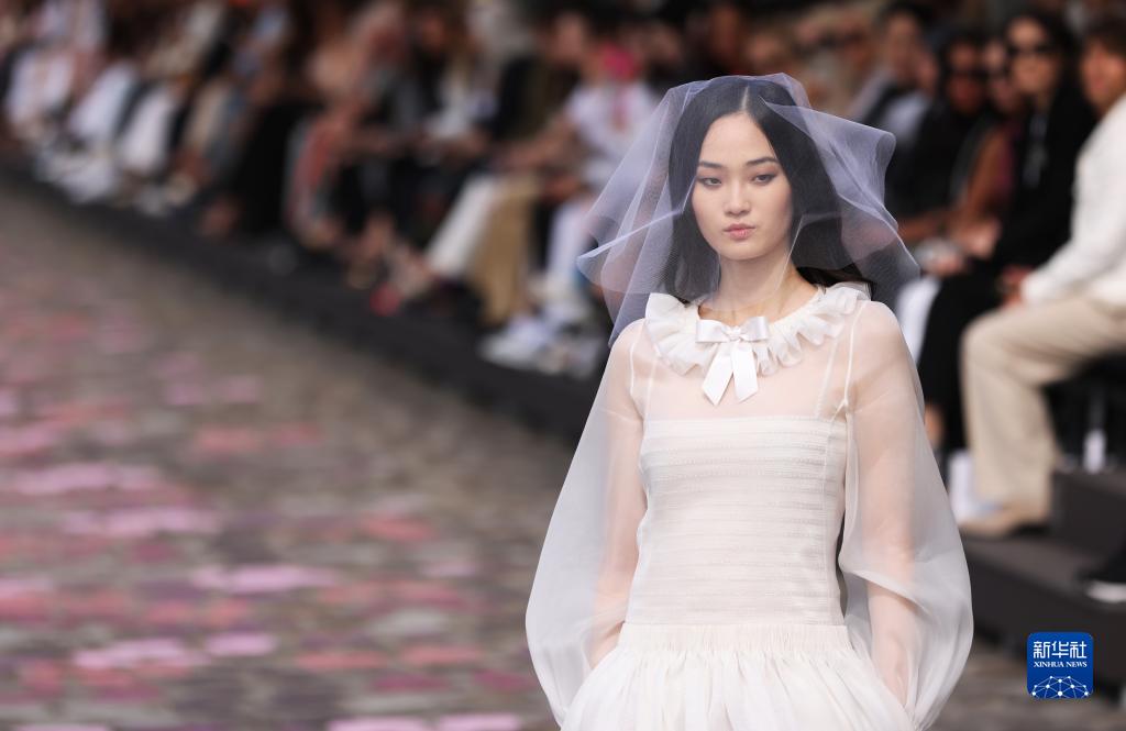 7月4日,在法國巴黎塞納河邊,模特展示法國品牌香奈兒2023/2024秋冬高級定制新品。