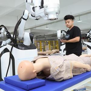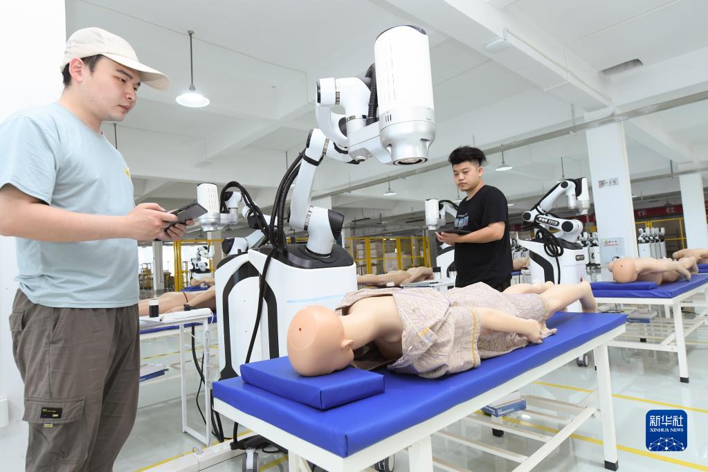 7月4日,在位于仙居縣的浙江千域智能科技有限公司,工作人員調試一款智能艾灸機器人。