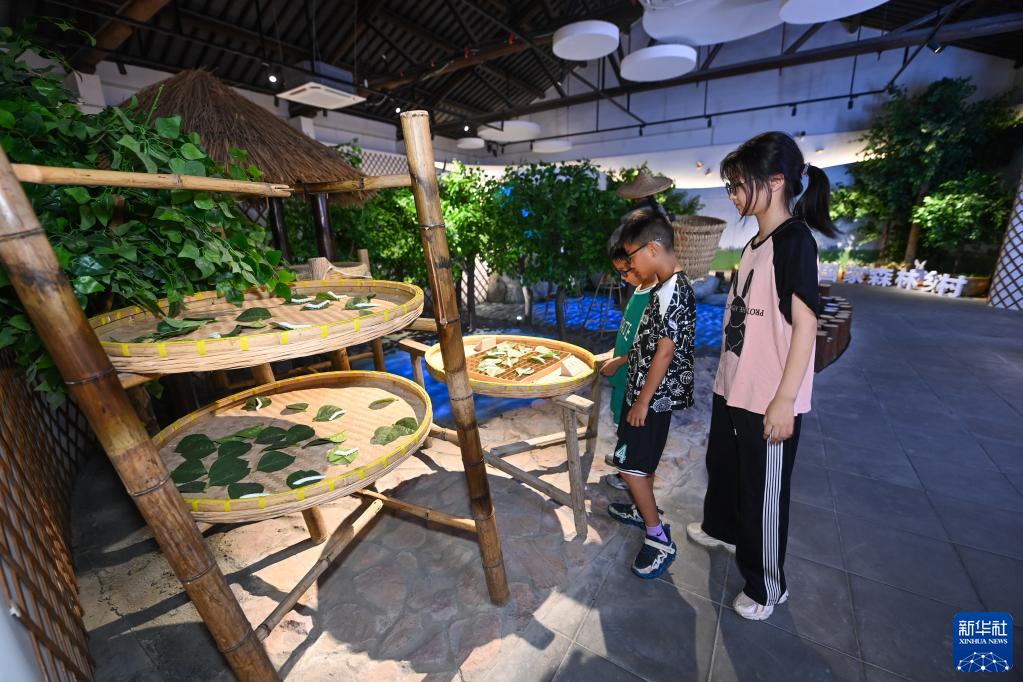 7月5日,孩子們正在參觀(guān)織里鎮伍浦村文化禮堂內的蠶桑文化展示。