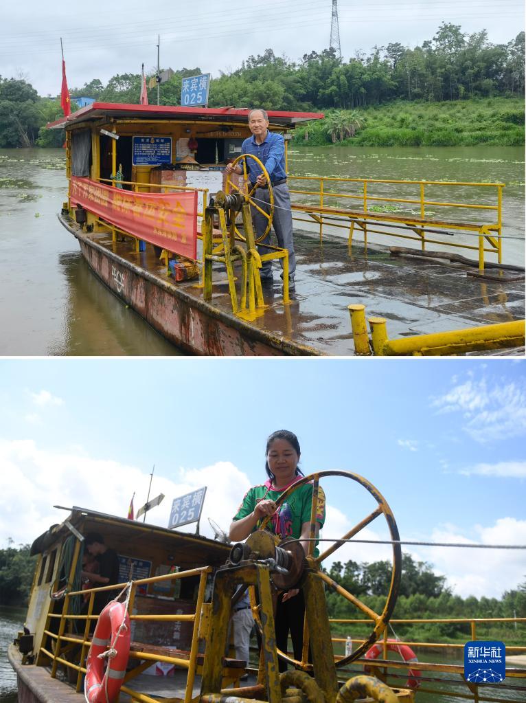 拼版照片:上圖為2022年5月11日拍攝的在廣西來(lái)賓市興賓區遷江鎮大力村清水河上,李曼榮的公公巫云飛生前在駕駛渡船(陸益丹攝);下圖為在廣西來(lái)賓市興賓區遷江鎮大力村清水河上,李曼榮在駕駛渡船(新華社記者陸波岸2023年7月4日攝)。