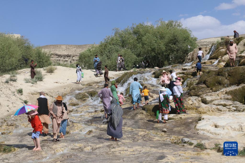 7月3日,游客在阿富汗巴米揚省班達米爾國家公園內游玩。