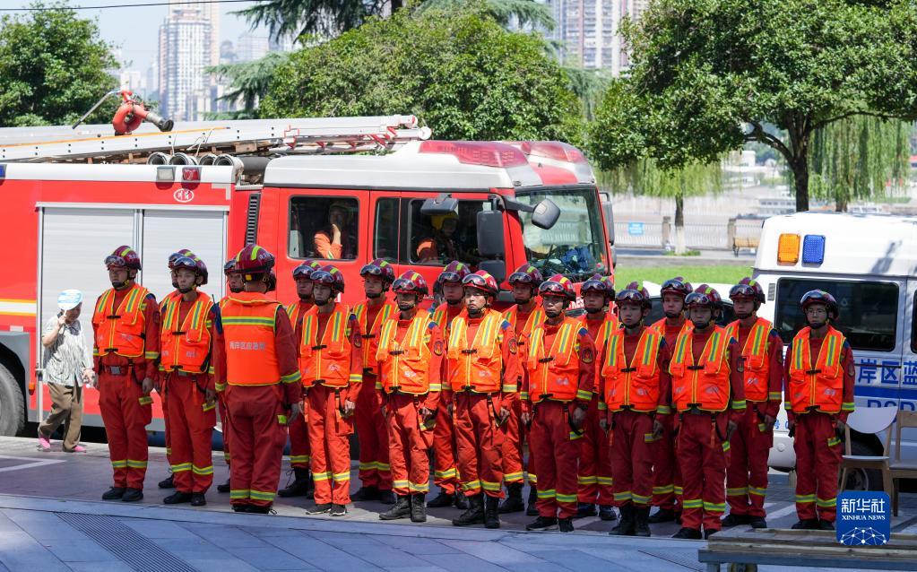 7月5日,參加防汛應急演練的消防救援人員在進(jìn)行防汛應急快速集結演練。