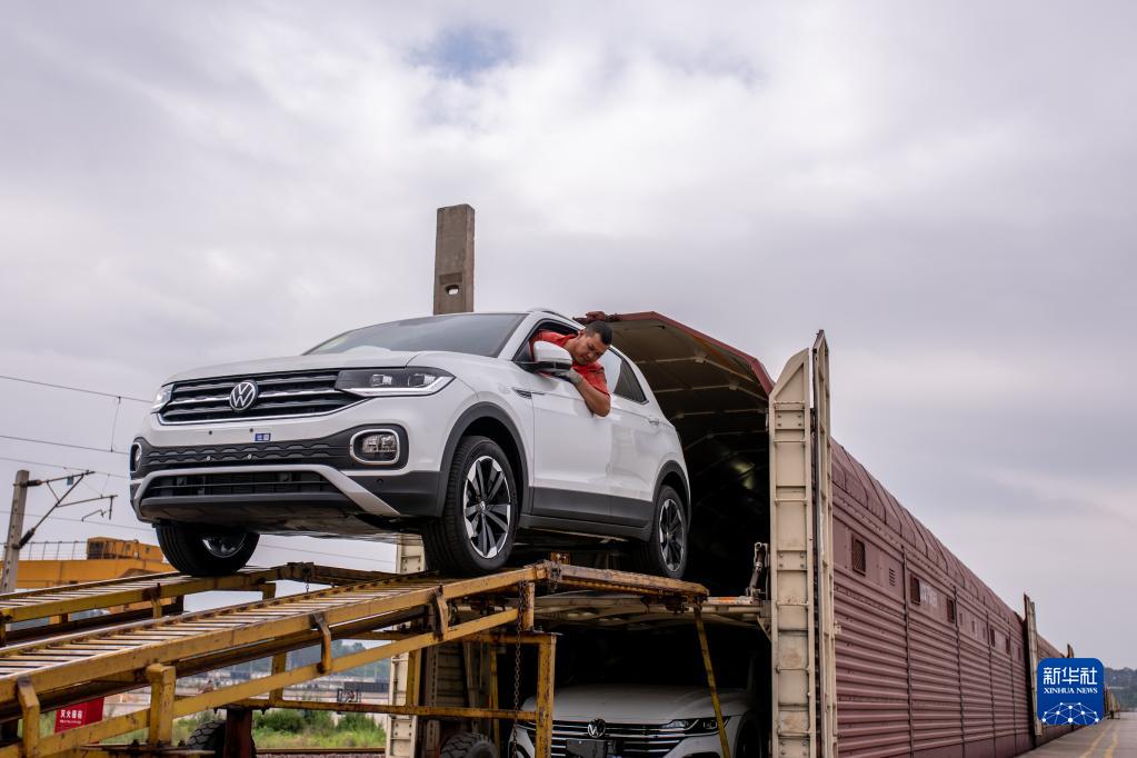 7月5日,工作人員在云南桃花村鐵路商品汽車(chē)物流基地駕駛商品車(chē)駛出火車(chē)車(chē)廂。