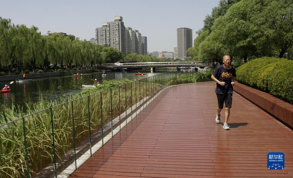 7月5日,市民在亮馬河畔的步道上跑步。