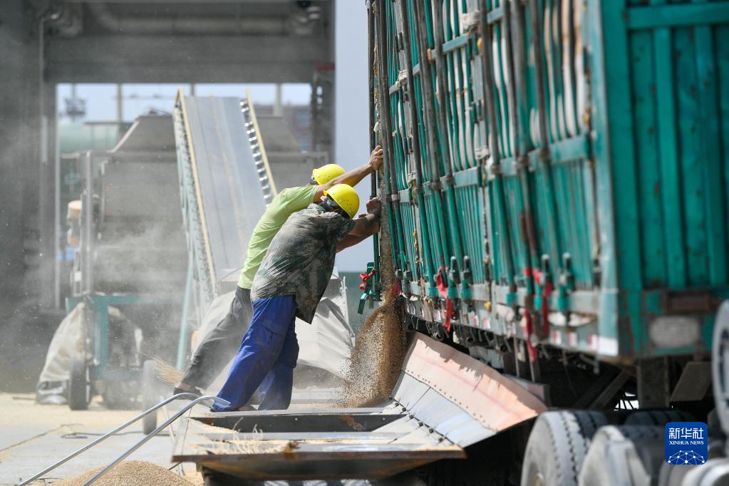 7月5日,在中央儲備糧天津東麗直屬庫有限公司大港分公司,工作人員在進(jìn)行卸糧作業(yè)。