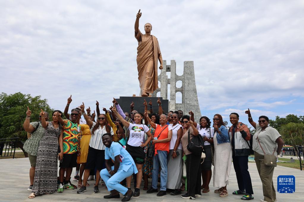 7月4日,游人在位于加納首都阿克拉的恩克魯瑪陵園內的恩克魯瑪塑像前拍照。