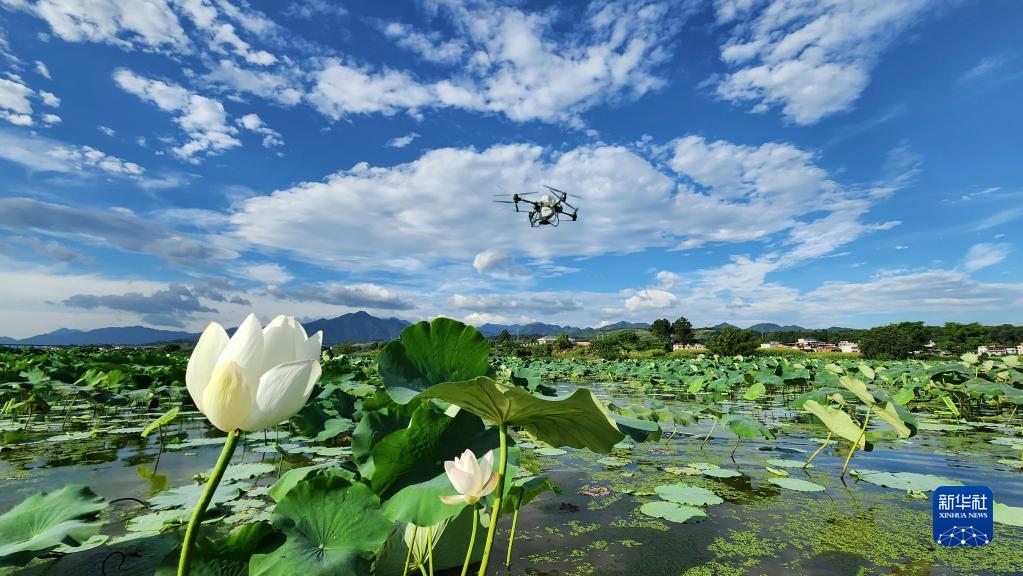 7月5日,植保無(wú)人機在湖南省常寧市板橋鎮蓮藕種植基地進(jìn)行飛防作業(yè)。