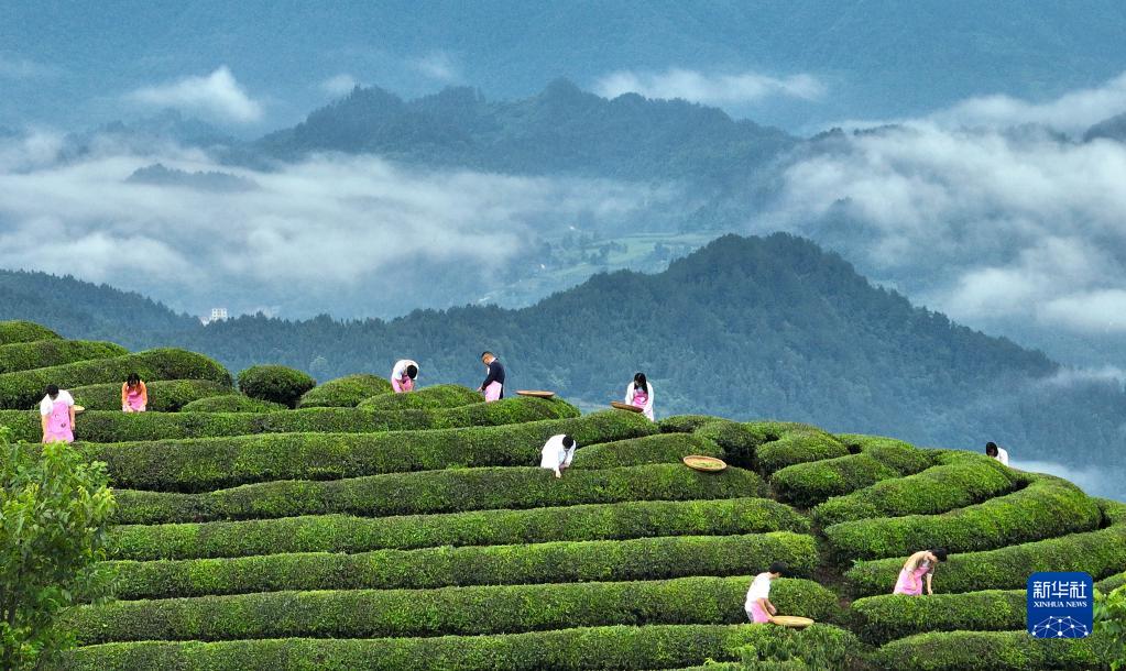 7月5日,茶農在貴州省岑鞏縣客樓鎮下寨村茶山采摘云霧茶(無(wú)人機照片)。