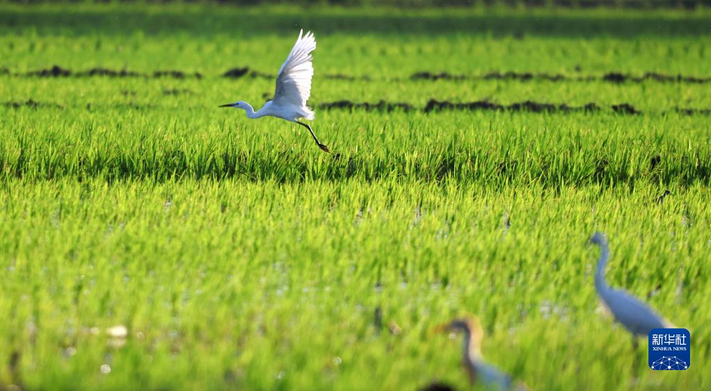 7月5日,白鷺在山東省臨沂市郯城縣郯城街道水稻田間飛舞。