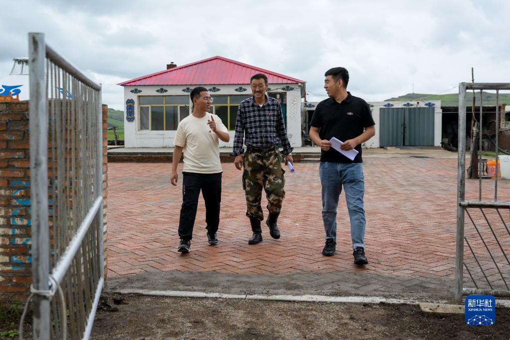 7月5日,在內蒙古興安盟科爾沁右翼前旗滿(mǎn)族屯滿(mǎn)族鄉一名牧民(中)家,邊境服務(wù)站工作人員與牧民交流。