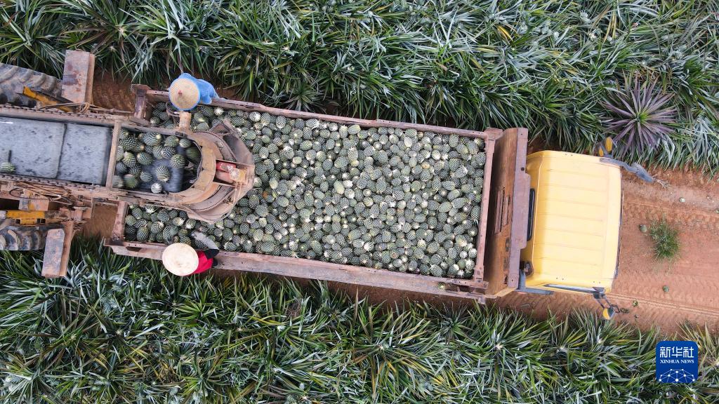 7月5日,在印度尼西亞楠榜省德邦易勿剎縣一處菠蘿種植園,人們將采摘下來(lái)的菠蘿裝車(chē)(無(wú)人機照片)。