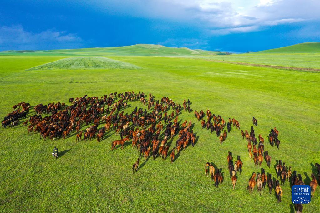7月5日,馬群在草原上奔跑(無(wú)人機照片)。