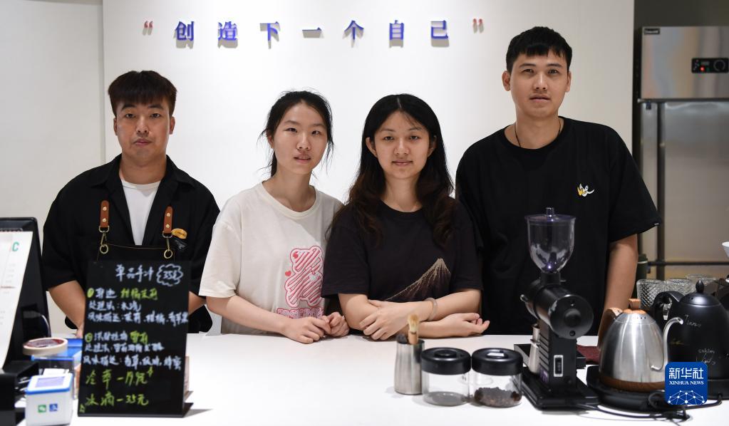 7月5日,在廣州市白云區的手心咖啡店,視障咖啡師陳柳曉(左三)和同事謝學(xué)通(右一)、巫佳純(左二)、楊培東合影。