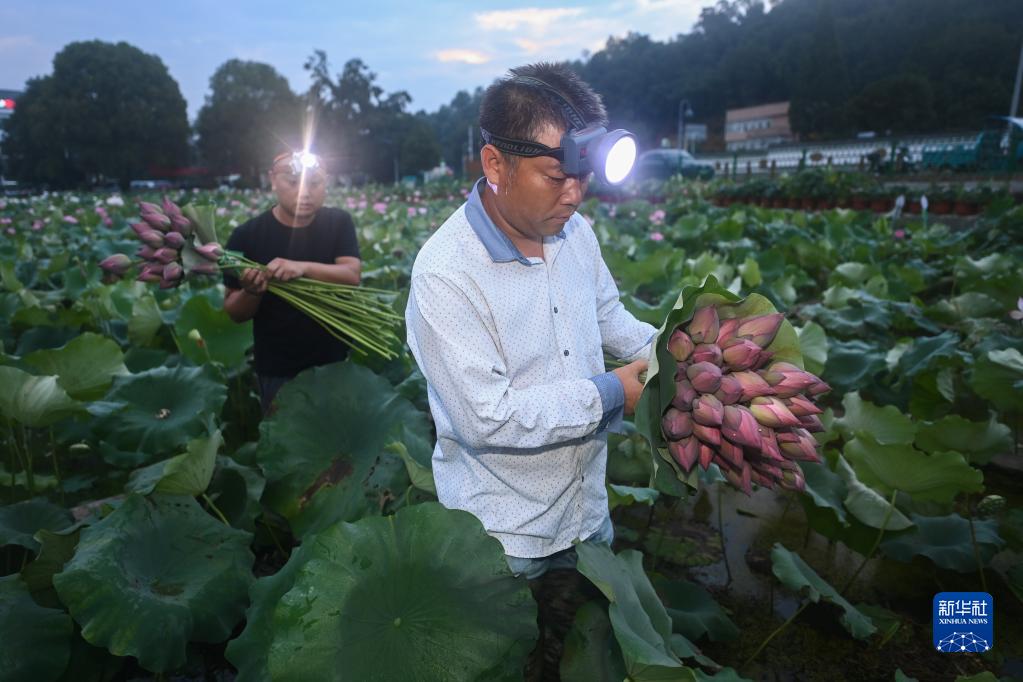 7月6日清晨,浙江省建德市大慈巖鎮里葉村村民在荷塘里摘荷花和蓮蓬。這些荷花、蓮蓬分類(lèi)包裝后,將快速運往江浙滬的花卉市場(chǎng)。