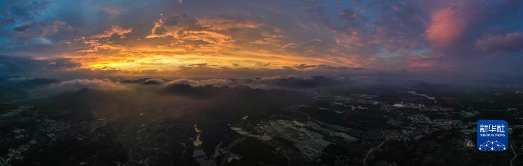 7月5日拍攝的晚霞籠罩下的浙江省建德市大慈巖鎮(無(wú)人機照片)。